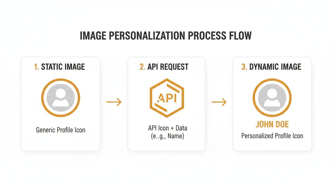 The whole process is surprisingly simple. Most integrations are built on one powerful idea: the dynamic image URL. Instead of using a link to a static file like image.jpg, you use a special URL that contains personalization variables. When a customer opens it, the API whips up a unique image just for them on the spot.