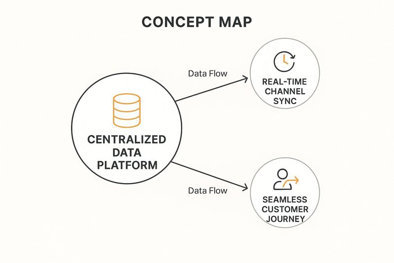 This concept map highlights how a Centralized Customer Data Platform feeds Cross-Channel Identity Resolution, which in turn enables Unified Journey Orchestration. Real-Time Synchronization ensures each channel stays up to date, while Channel-Appropriate Content Adaptation and Consistent Messaging guarantee brand coherence. Seamless handoffs between digital and physical experiences tie everything together.