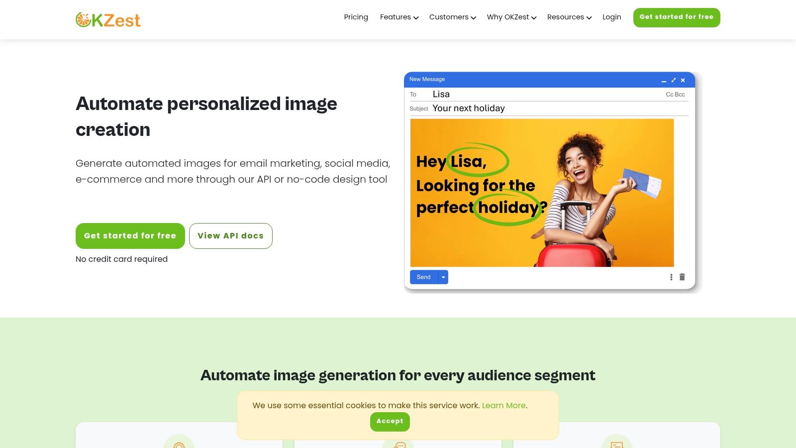 | OKZest 🏆 | ✨ Personalized image merge-tags; no-code visual editor + REST API; real-time data & fallbacks | ★★★★★ — fast setup & responsive support | 💰 Free → Enterprise (scales to millions/mo) | 👥 Marketers, agencies, devs, email teams | ✨ 99% ESP compatibility; merge-tags for emails & HTML snippets; team/project management |