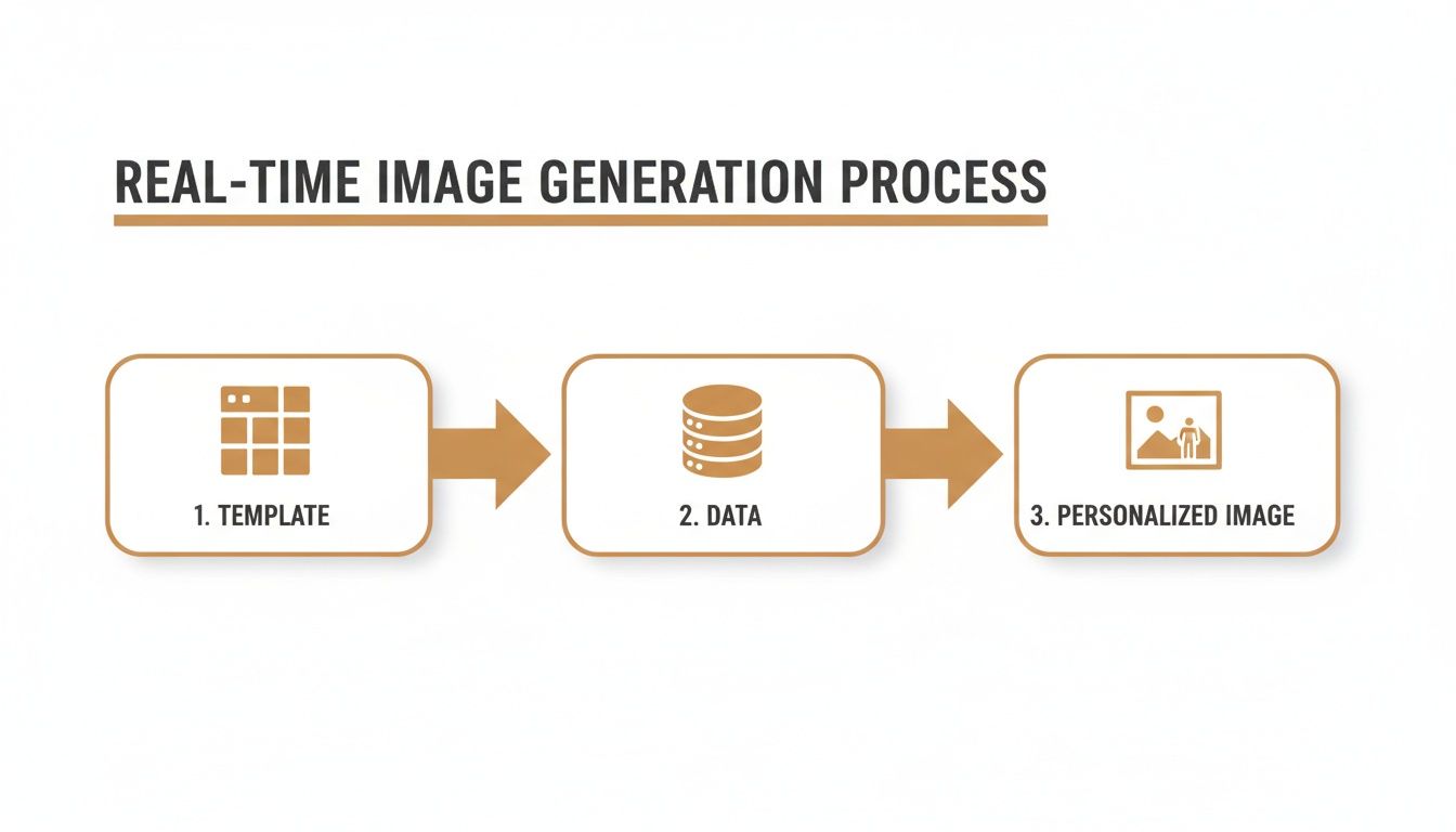 Think of it like a mail merge, but for images. You’re probably used to pulling in a customer’s name to personalize a sentence. This is the same idea, but instead of text, you’re dynamically building a brand new image for each recipient. It all starts with a single base template, but by using individual data points, you can instantly render thousands—or even millions—of personalized variations on the fly.