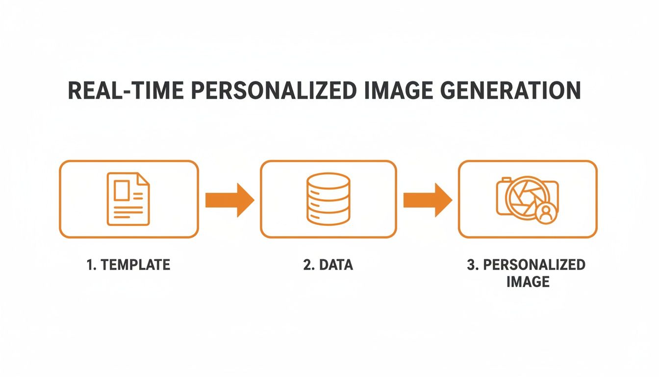 At its heart, this tech automates the creation of custom visuals. You start with a base template you've designed—maybe it has your branding, a background, and some empty spots for dynamic info. When someone opens the email, the API instantly fills in those blanks with their specific data, "rendering" a brand-new, unique image in just a few milliseconds.